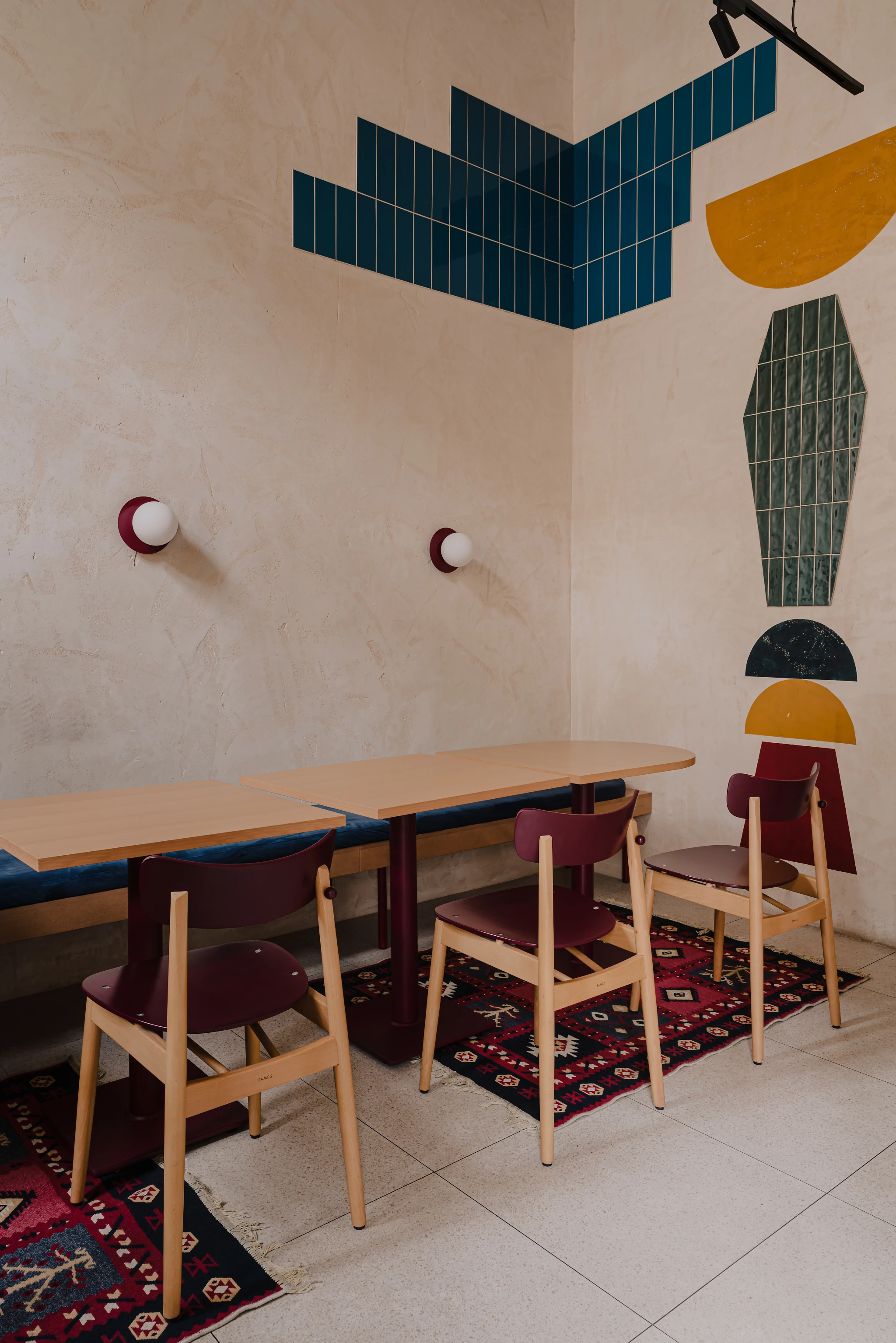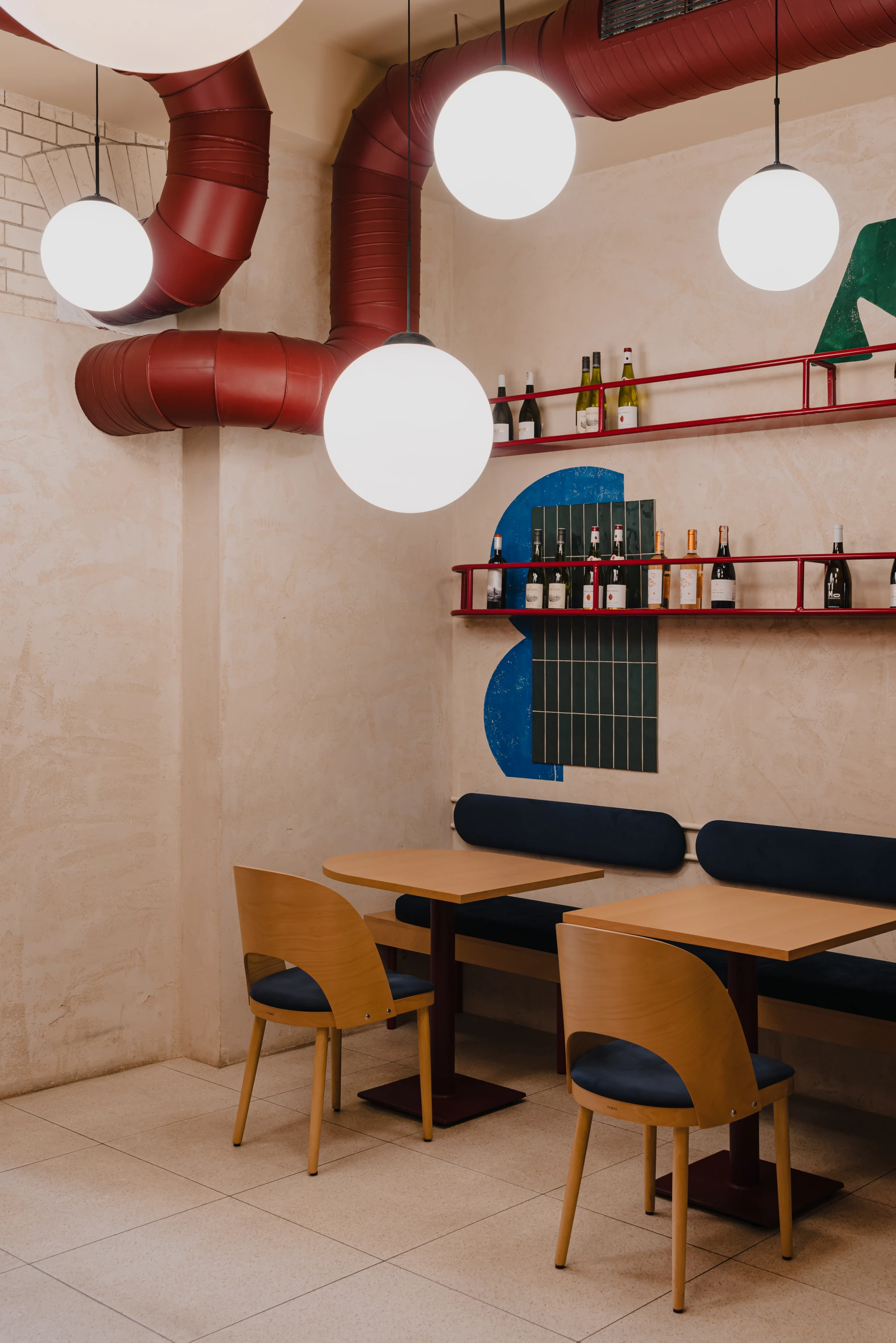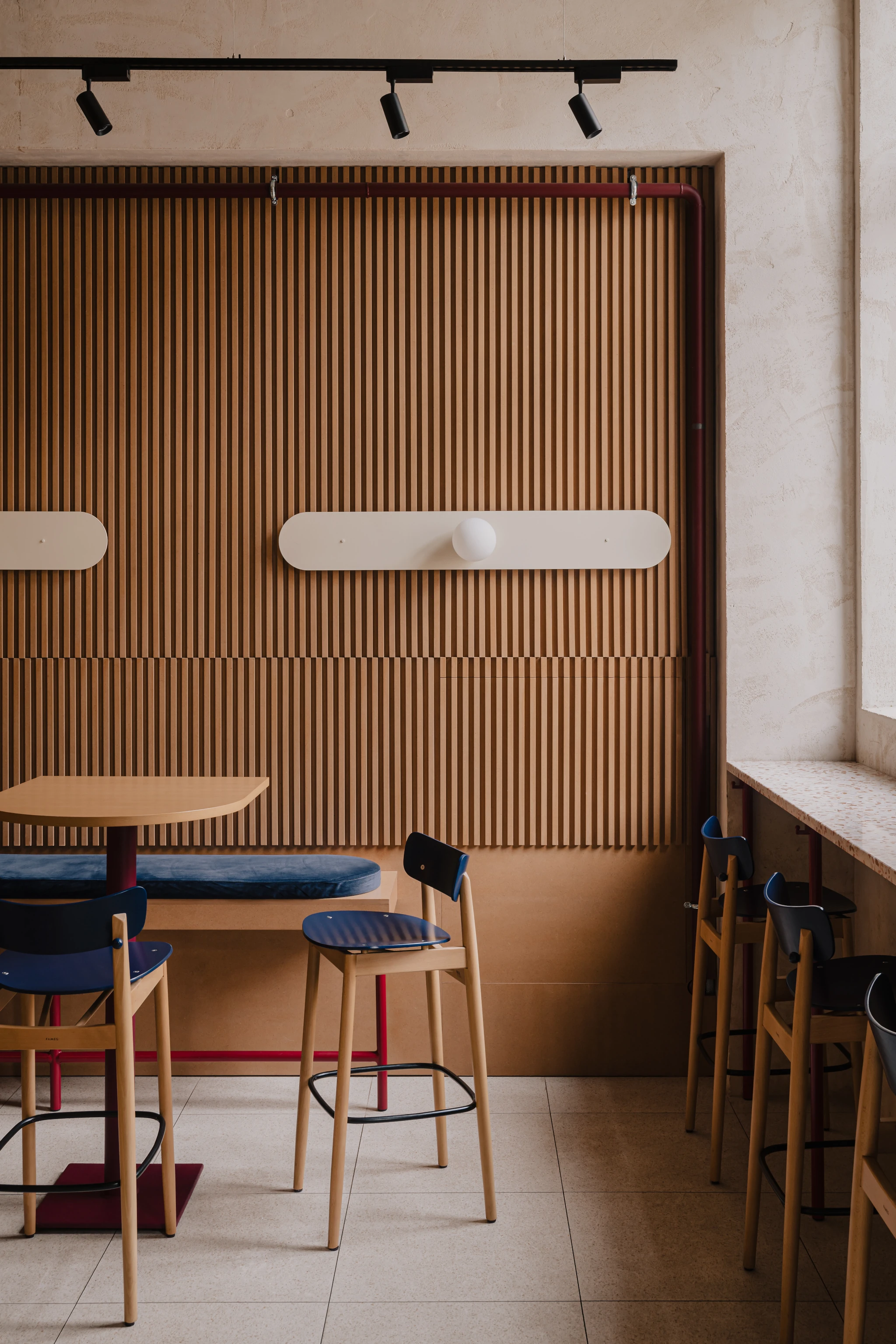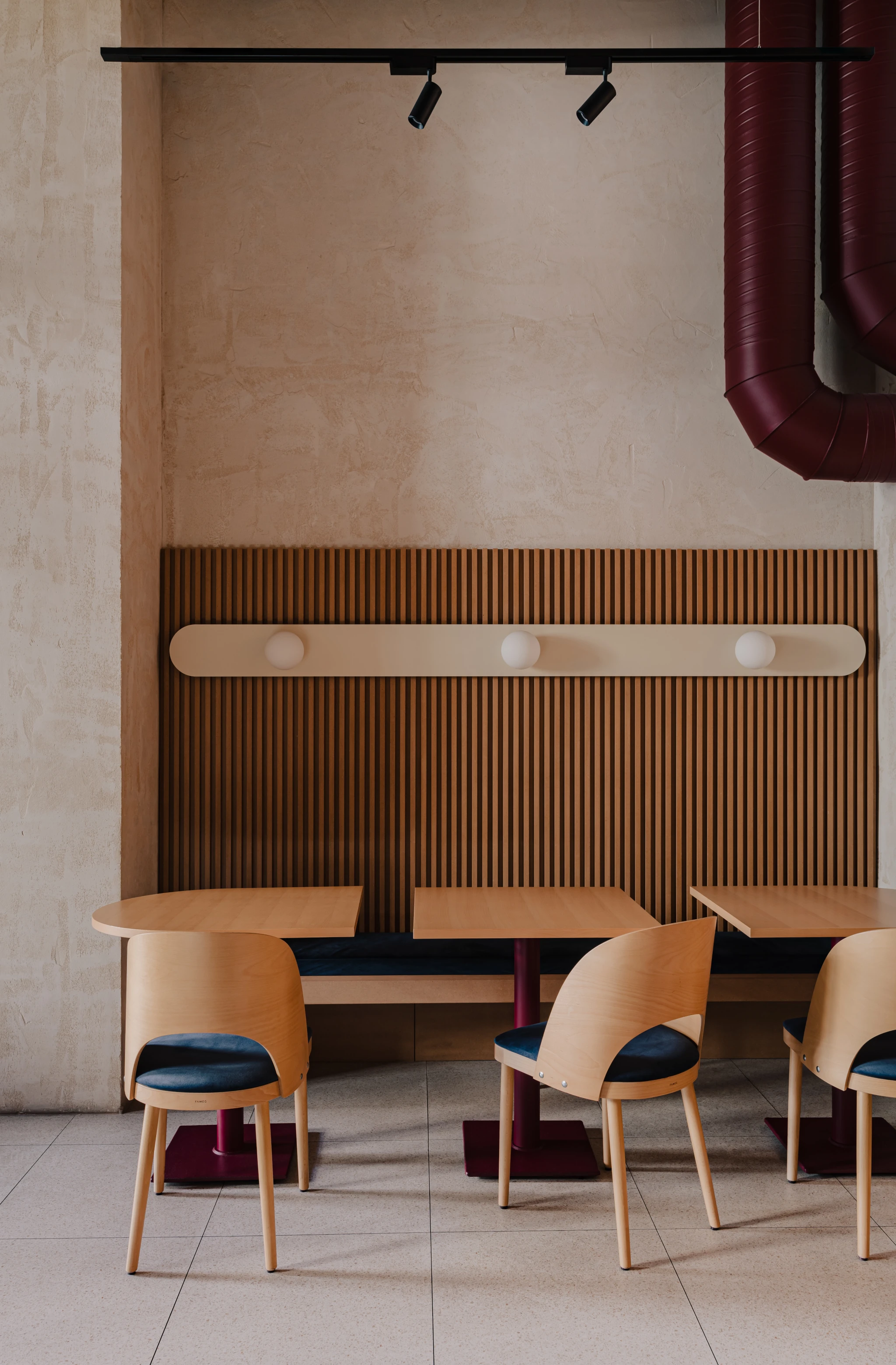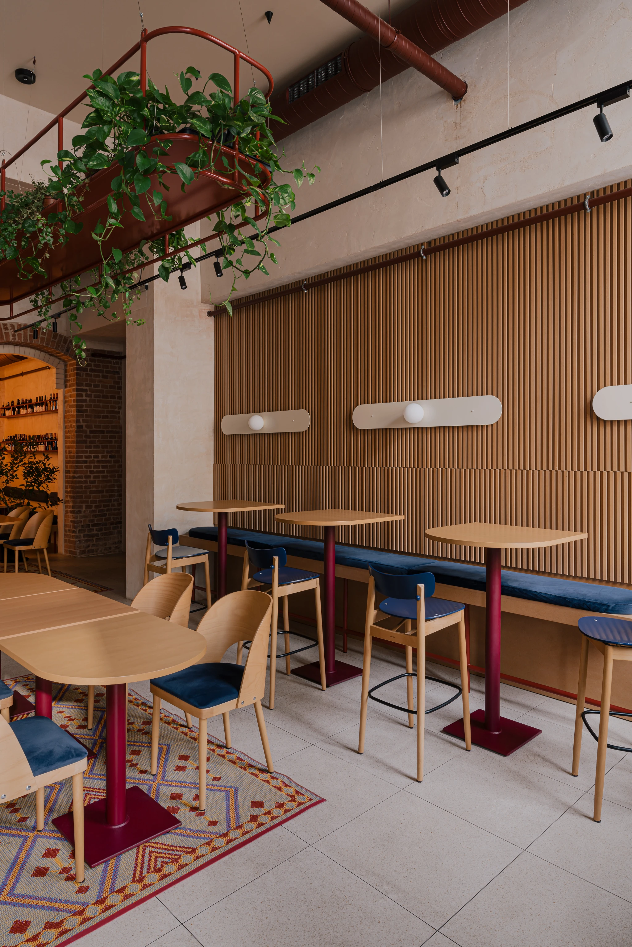 doświetlenie światłem naturalnym zmniejsza się im bardziej zanurzamy się w głąb restauracji. zainspirowało nas to do gradientowego