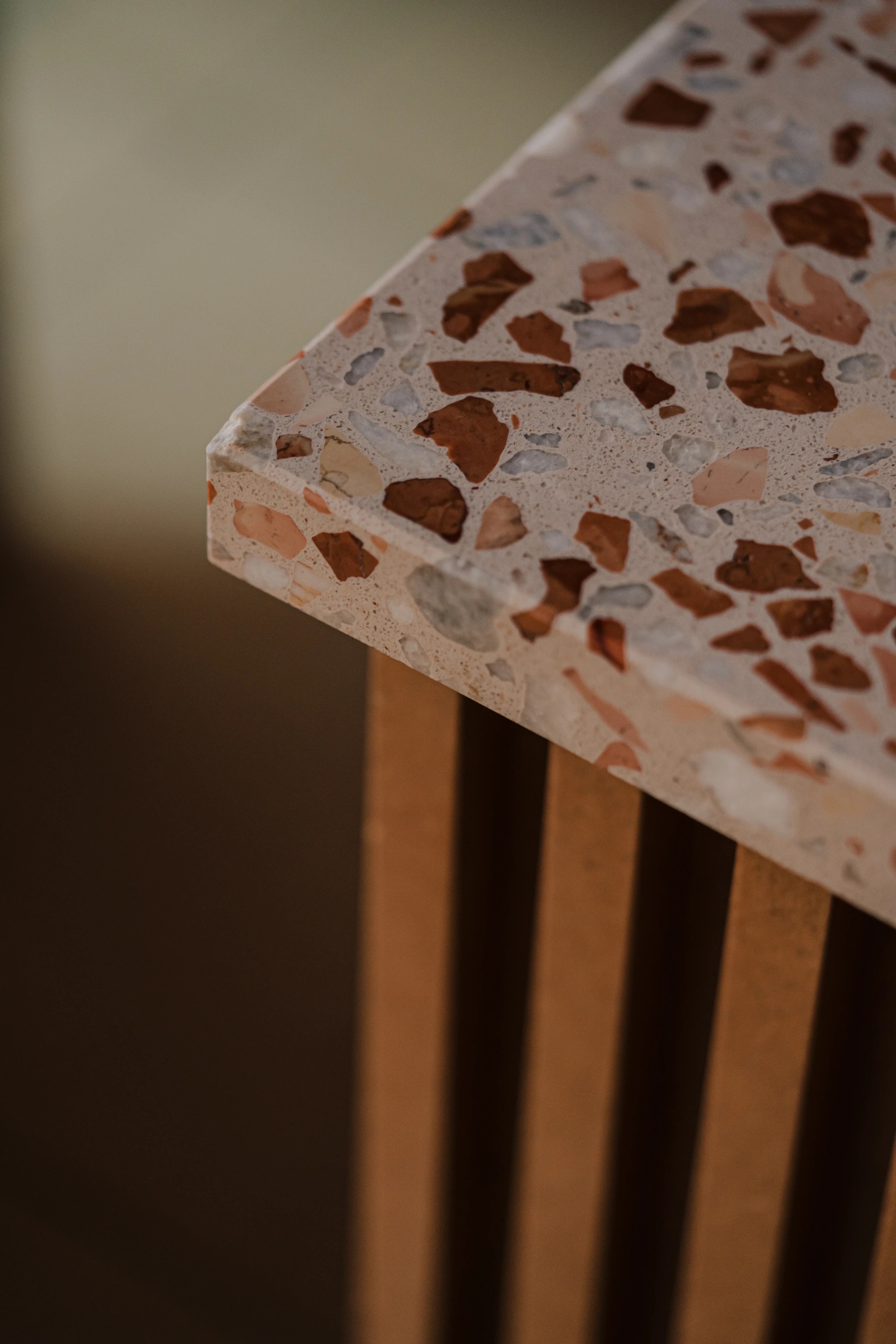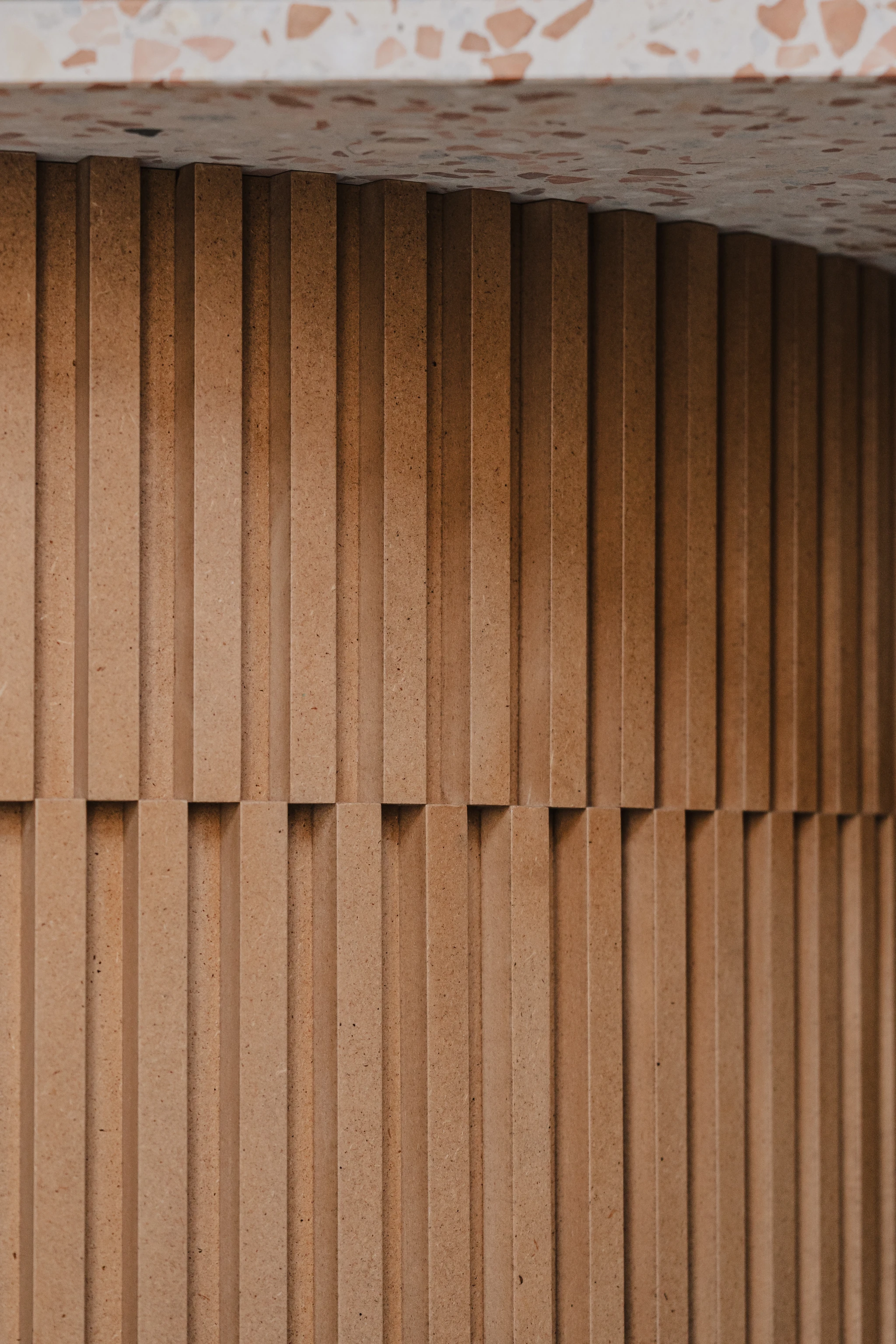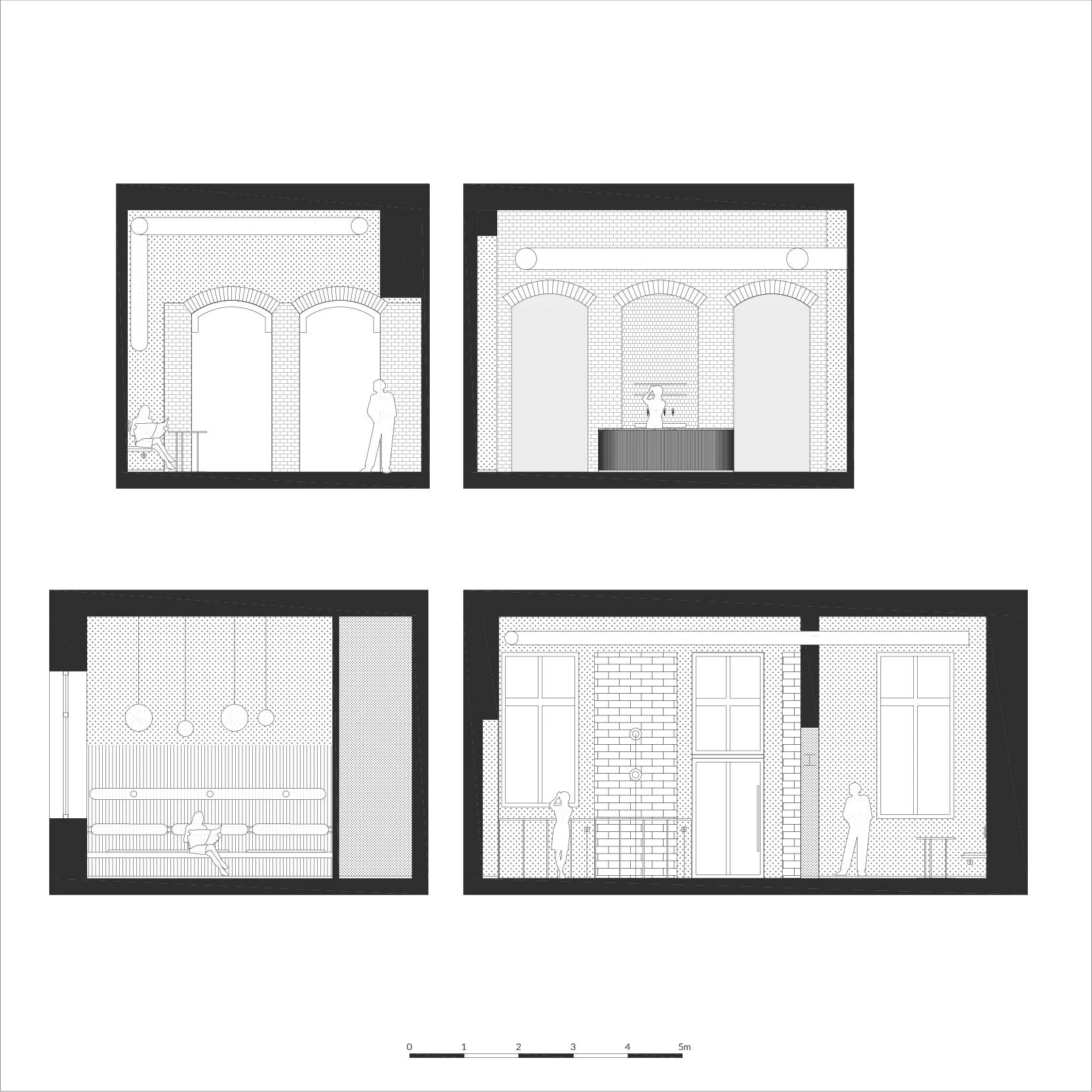 przy pracach wykończeniowych i meblarskich koncentrowaliśmy się na użyciu naturalnych, prostych materiałów w niecodziennym wydaniu, zmieniając ich charakter różnorodnością faktur i struktur oraz miejscem ich wykorzystania. łączyliśmy tynki gruboziarniste z surową płytą mdf, pluszowe tapicerki z historyczną cegłą, lastriko z bukowym drewnem i neonem, gresowe posadzki z bordowym kolorem stalowych elementów i kanałów wentylacyjnych.