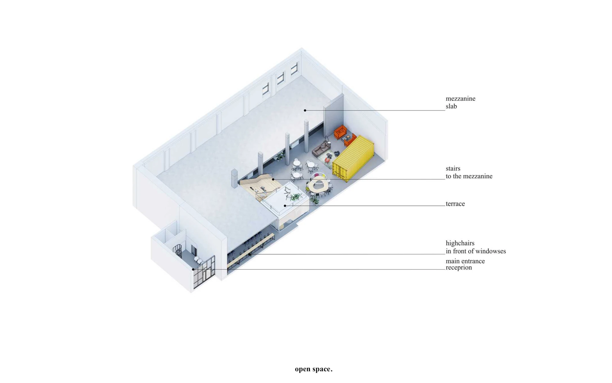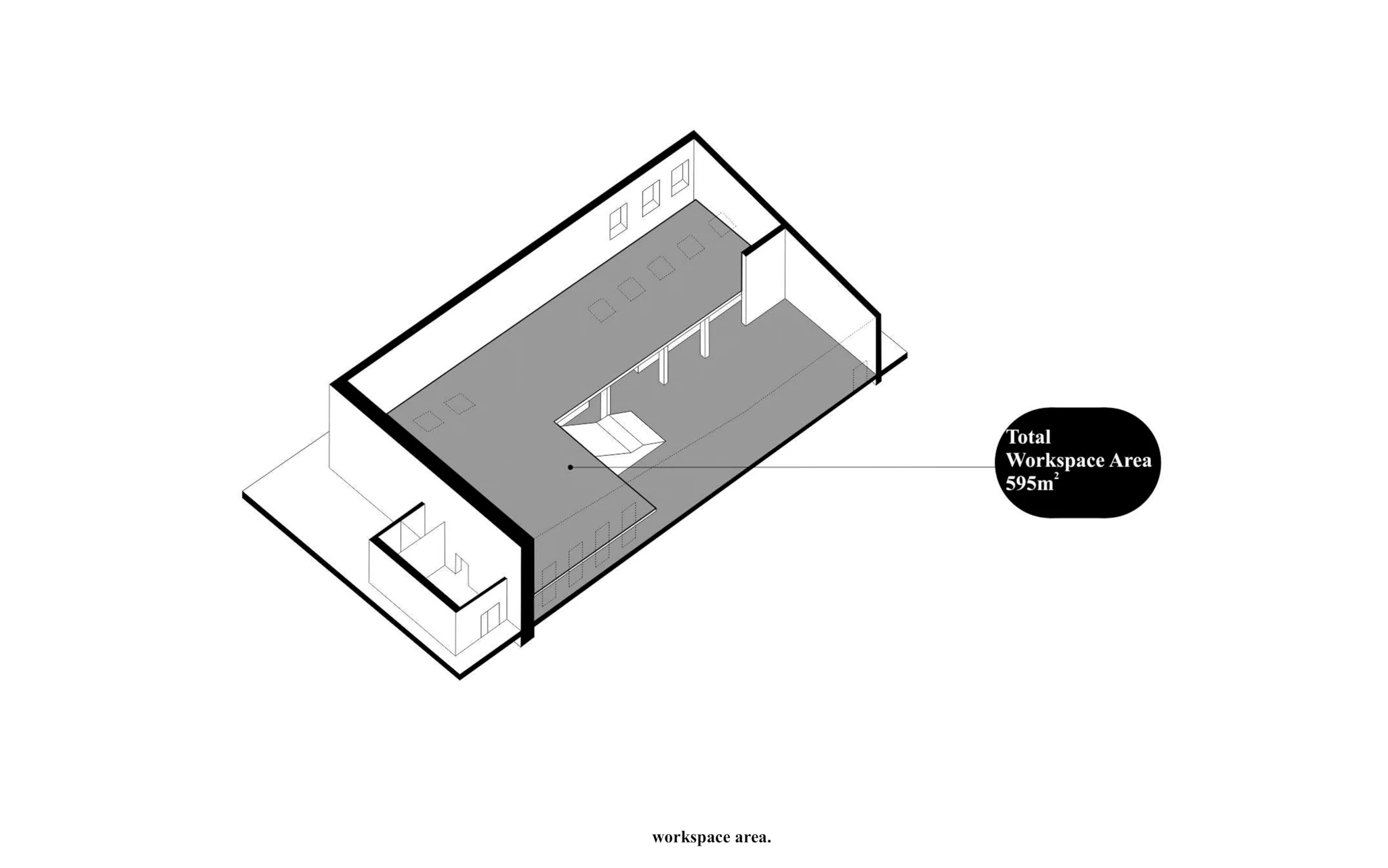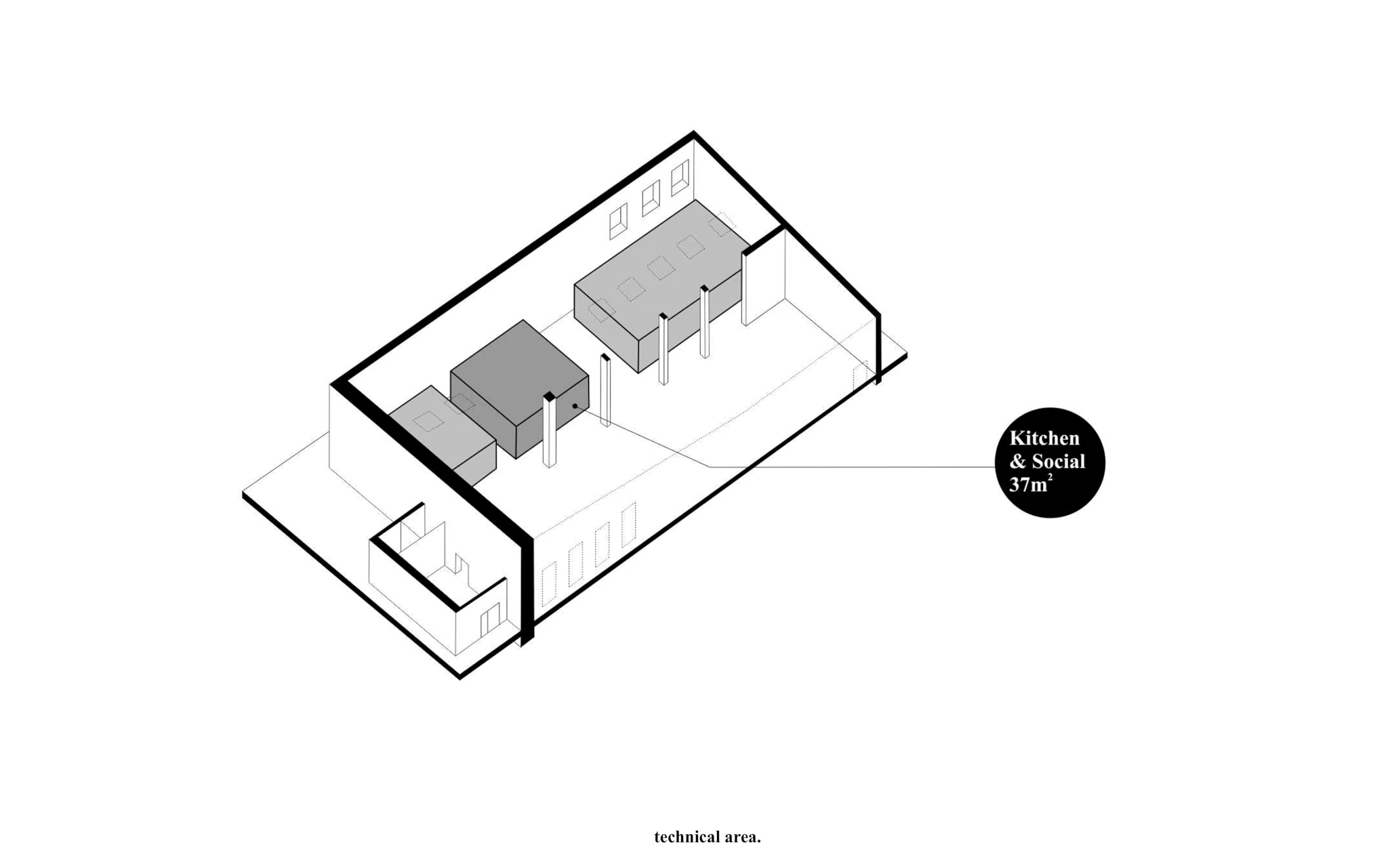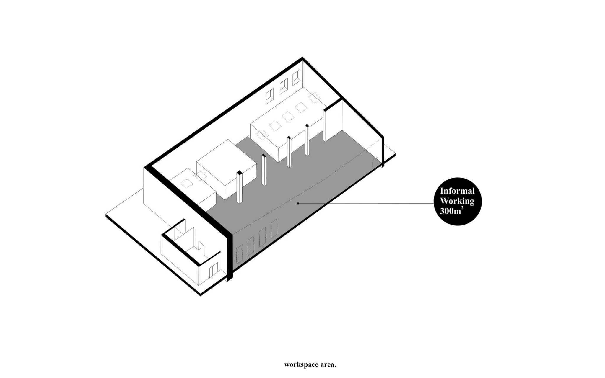 Zadaniem projektowym była próba adaptacji części starej fabryki Miracullum w Krakowie na powierzchnie biurowe. Ze względu na niewielka ilość okien w hali i spora ilość świetlików dachowych zdecydowaliśmy się podzielić przestrzeń pracy na dwie podstawowe grupy. Pierwsza z nich, praca skupiona w dłuższym wymiarze godzin została zlokalizowana na zaprojektowanej antresoli tak, aby móc skorzystać w sposób optymalny z dostającego się przez świetliki dachowe światła dziennego. Praca nieformalna, grupowa, oraz chwilowa została zaplanowana na parterze budynku wraz z zapleczem socjalnym, kuchnią oraz toaletami. Dzięki wprowadzonej antresoli powierzchnia najmu zwiększyła się o 75%. W ramach dodatkowej przestrzeni wspólnej zostały zaprojektowane schody stanowiące również formę trybun podczas wykładów i warsztatów w większej grupie pracowników.