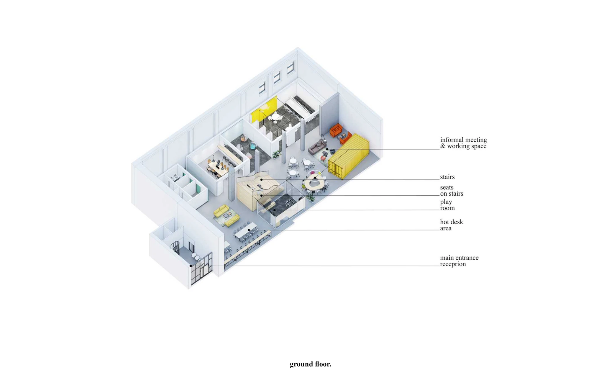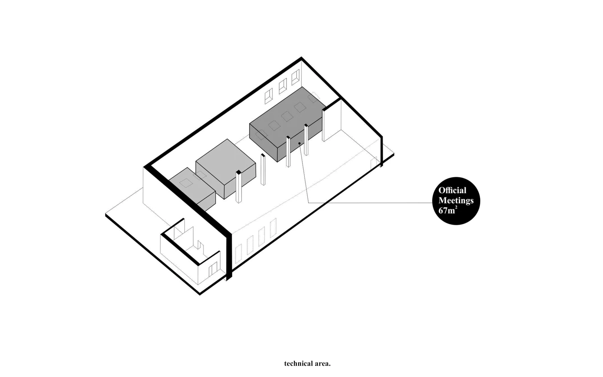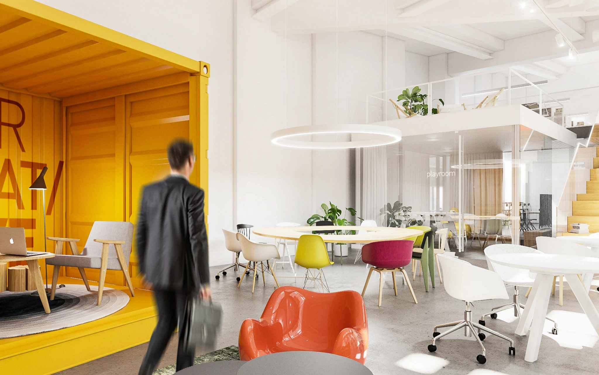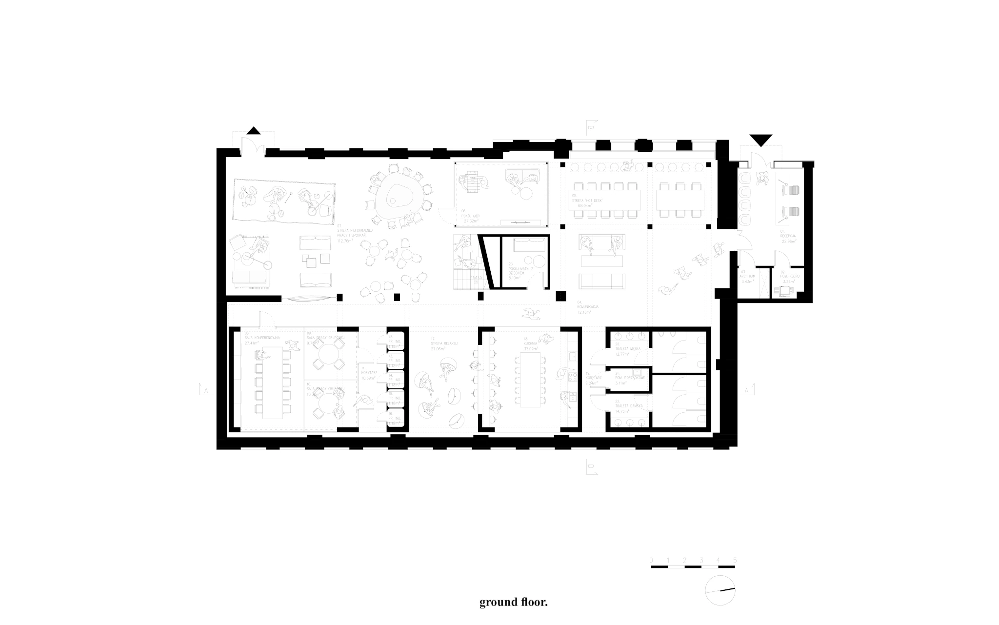 Zadaniem projektowym była próba adaptacji części starej fabryki Miracullum w Krakowie na powierzchnie biurowe. Ze względu na niewielka ilość okien w hali i spora ilość świetlików dachowych zdecydowaliśmy się podzielić przestrzeń pracy na dwie podstawowe grupy. Pierwsza z nich, praca skupiona w dłuższym wymiarze godzin została zlokalizowana na zaprojektowanej antresoli tak, aby móc skorzystać w sposób optymalny z dostającego się przez świetliki dachowe światła dziennego. Praca nieformalna, grupowa, oraz chwilowa została zaplanowana na parterze budynku wraz z zapleczem socjalnym, kuchnią oraz toaletami. Dzięki wprowadzonej antresoli powierzchnia najmu zwiększyła się o 75%. W ramach dodatkowej przestrzeni wspólnej zostały zaprojektowane schody stanowiące również formę trybun podczas wykładów i warsztatów w większej grupie pracowników.