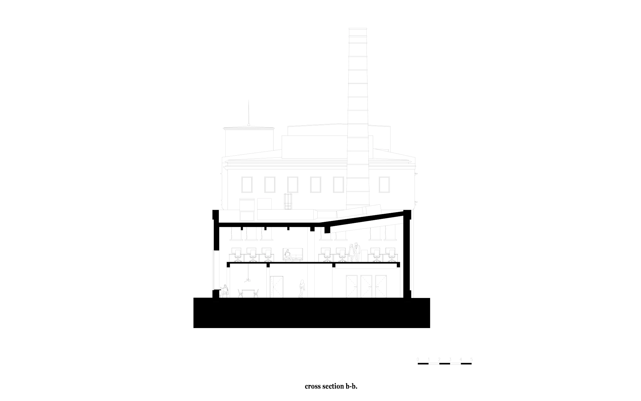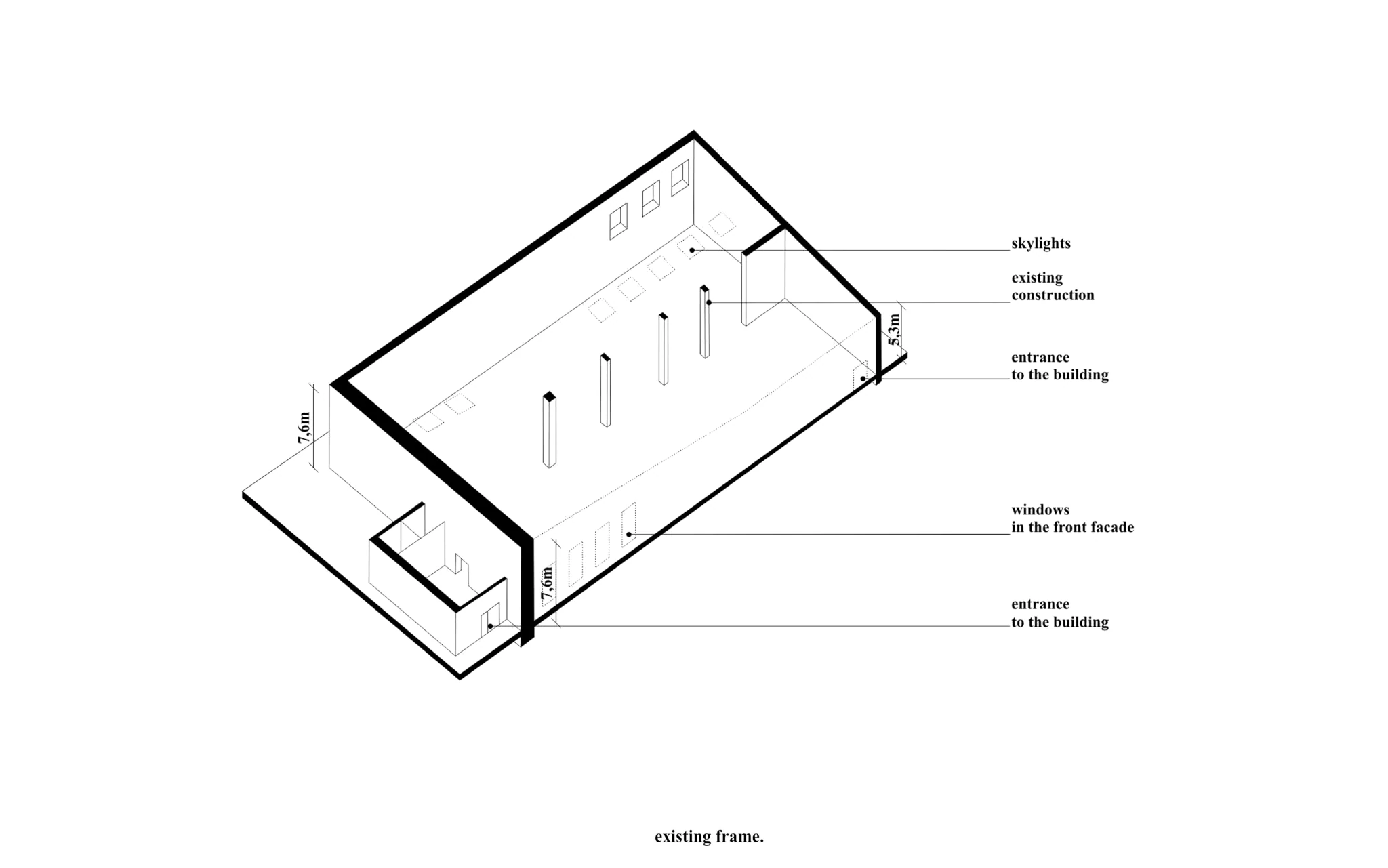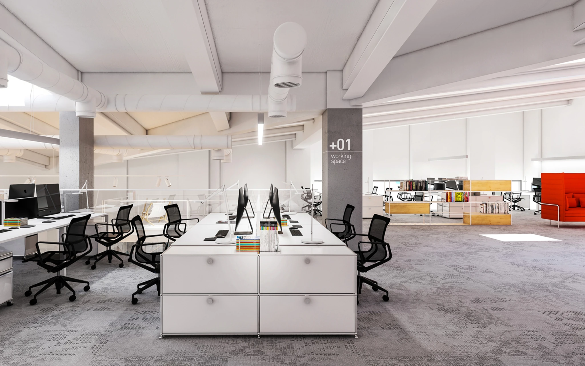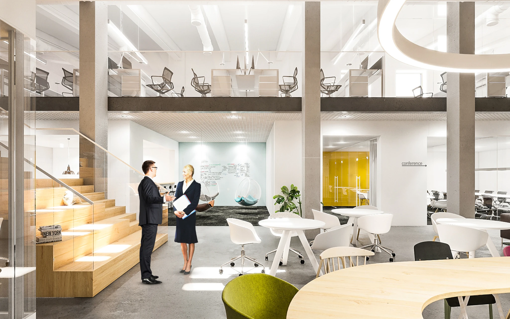 Zadaniem projektowym była próba adaptacji części starej fabryki Miracullum w Krakowie na powierzchnie biurowe. Ze względu na niewielka ilość okien w hali i spora ilość świetlików dachowych zdecydowaliśmy się podzielić przestrzeń pracy na dwie podstawowe grupy. Pierwsza z nich, praca skupiona w dłuższym wymiarze godzin została zlokalizowana na zaprojektowanej antresoli tak, aby móc skorzystać w sposób optymalny z dostającego się przez świetliki dachowe światła dziennego. Praca nieformalna, grupowa, oraz chwilowa została zaplanowana na parterze budynku wraz z zapleczem socjalnym, kuchnią oraz toaletami. Dzięki wprowadzonej antresoli powierzchnia najmu zwiększyła się o 75%. W ramach dodatkowej przestrzeni wspólnej zostały zaprojektowane schody stanowiące również formę trybun podczas wykładów i warsztatów w większej grupie pracowników.